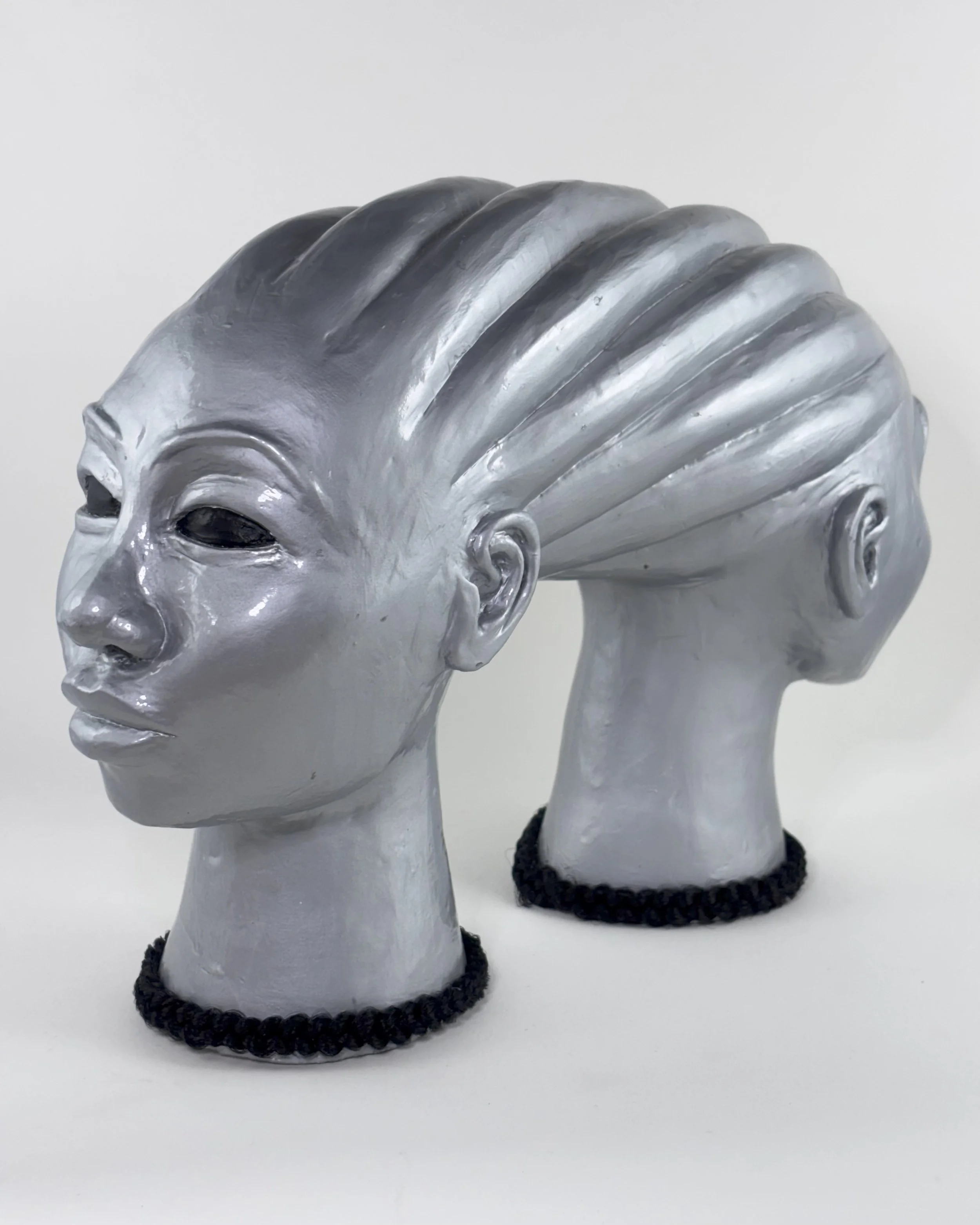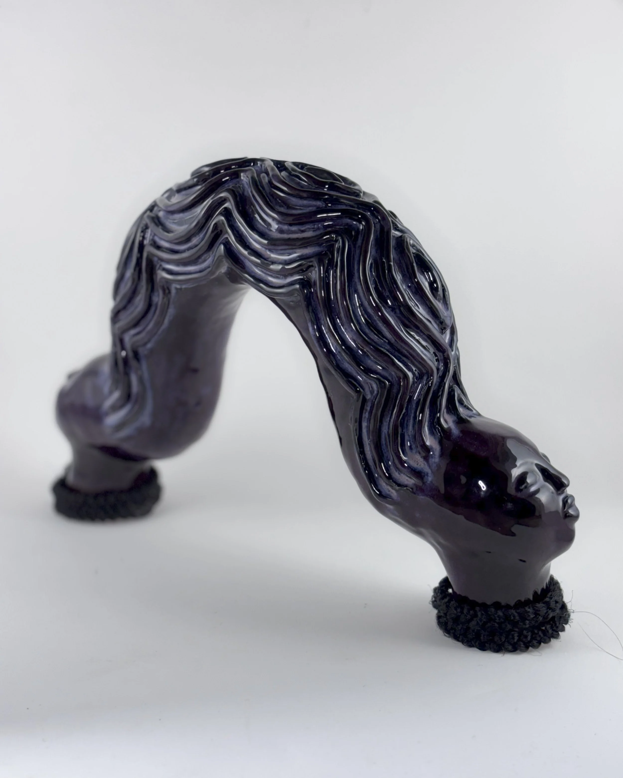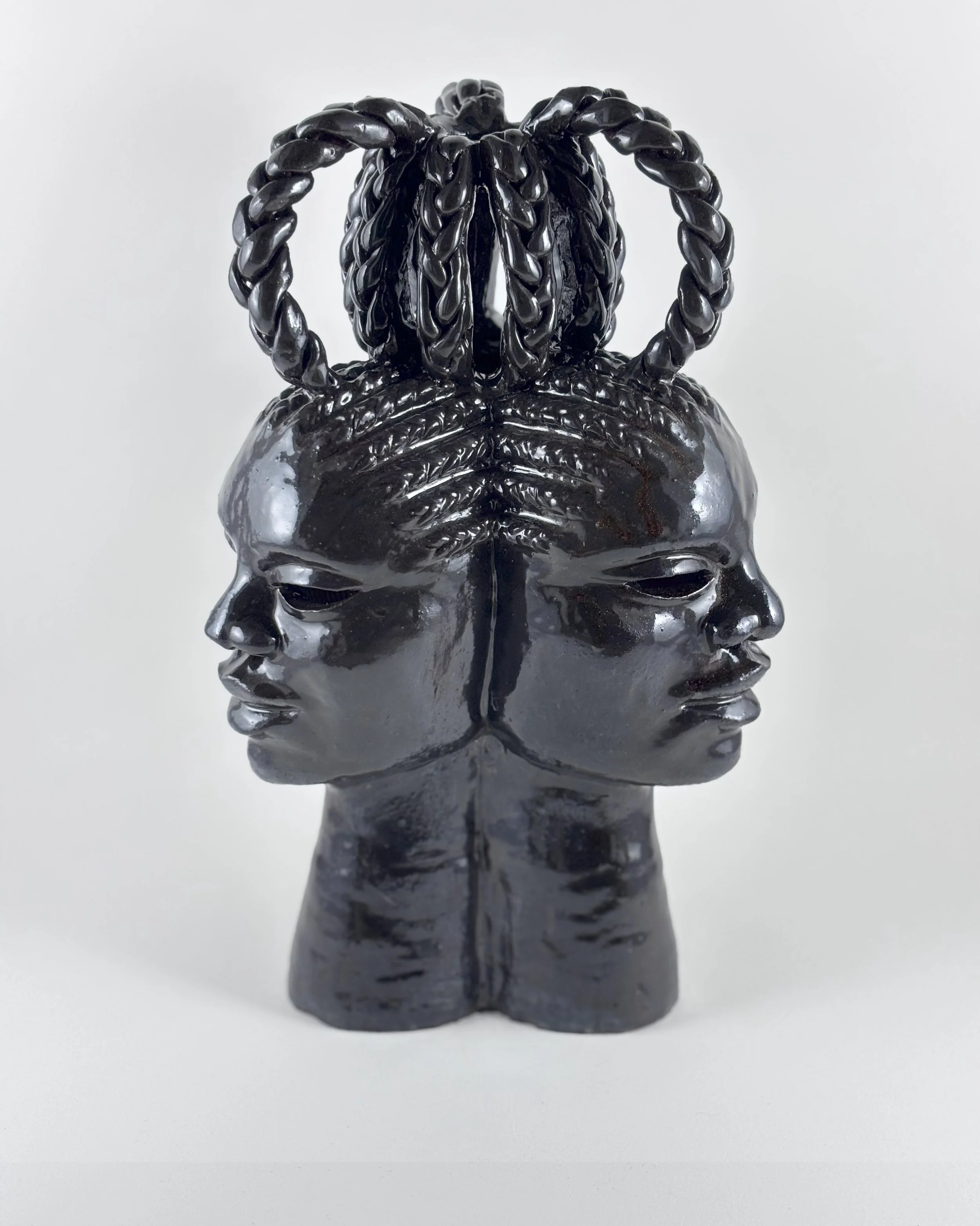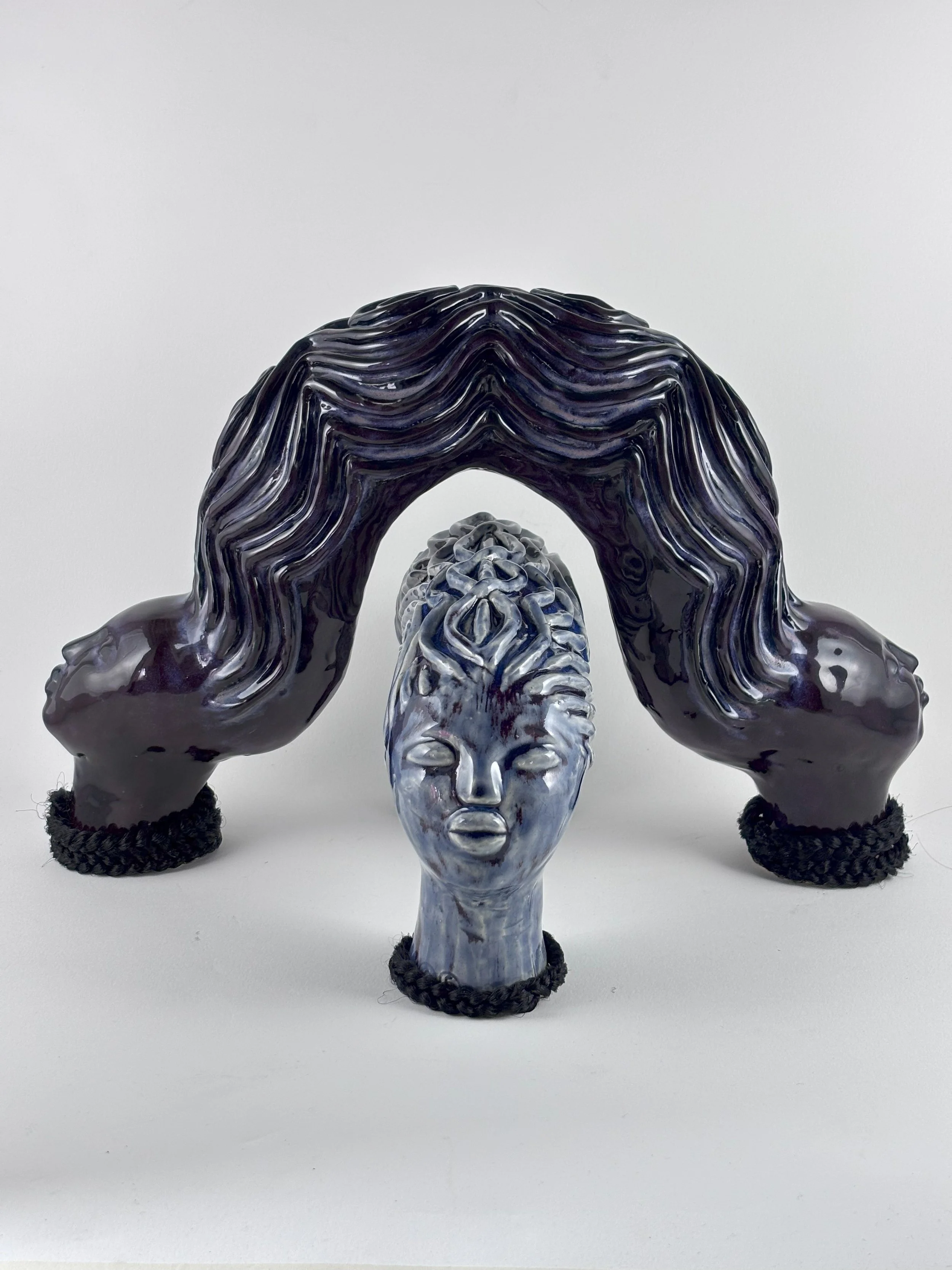 Hairhood: the Strands that Connect Us is a collection of ceramic sculptures that explore the ways in which hair and hairstyling connect black women, femmes, and girls. Through form, structure, and texture, these sculptures aim to make visible the figurative and literal bonds between Black women and femmes. Braids, twists, locs, bantu knots, and cornrows appear in the pieces as structural supports physically linking the femme figures to each other to investigate themes of intimacy, care, and closeness. Through an afro-futurist aesthetic and structurally intricate forms, these works play with the limits of what Black hair can do visually and culturally.