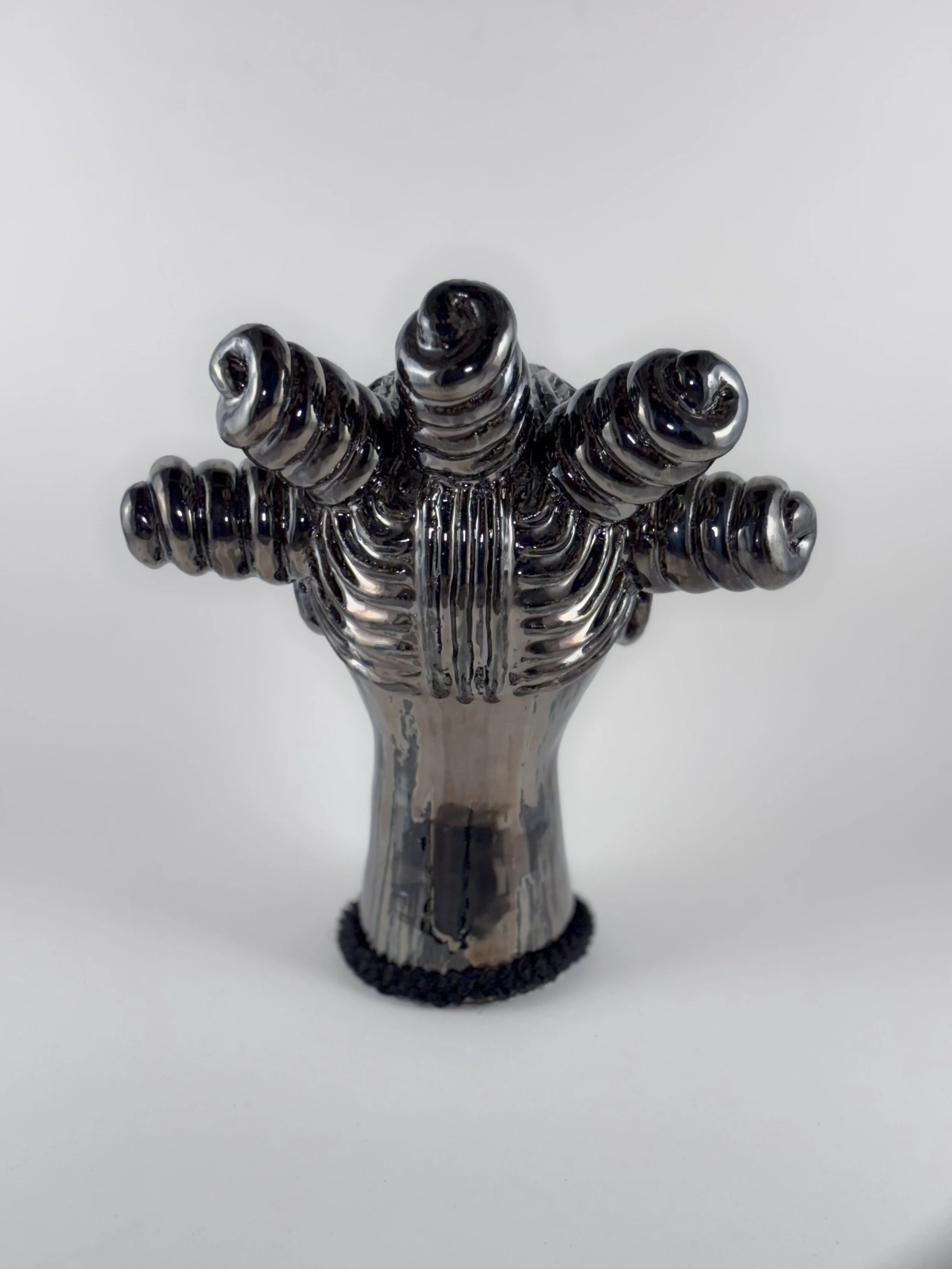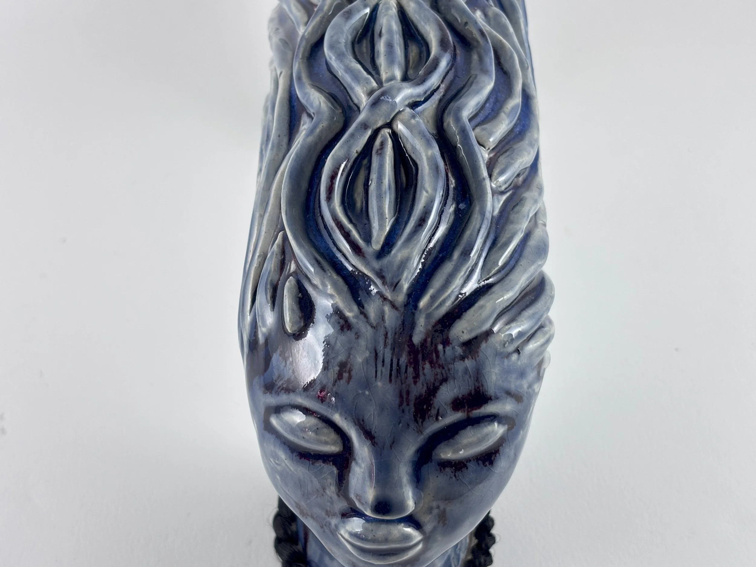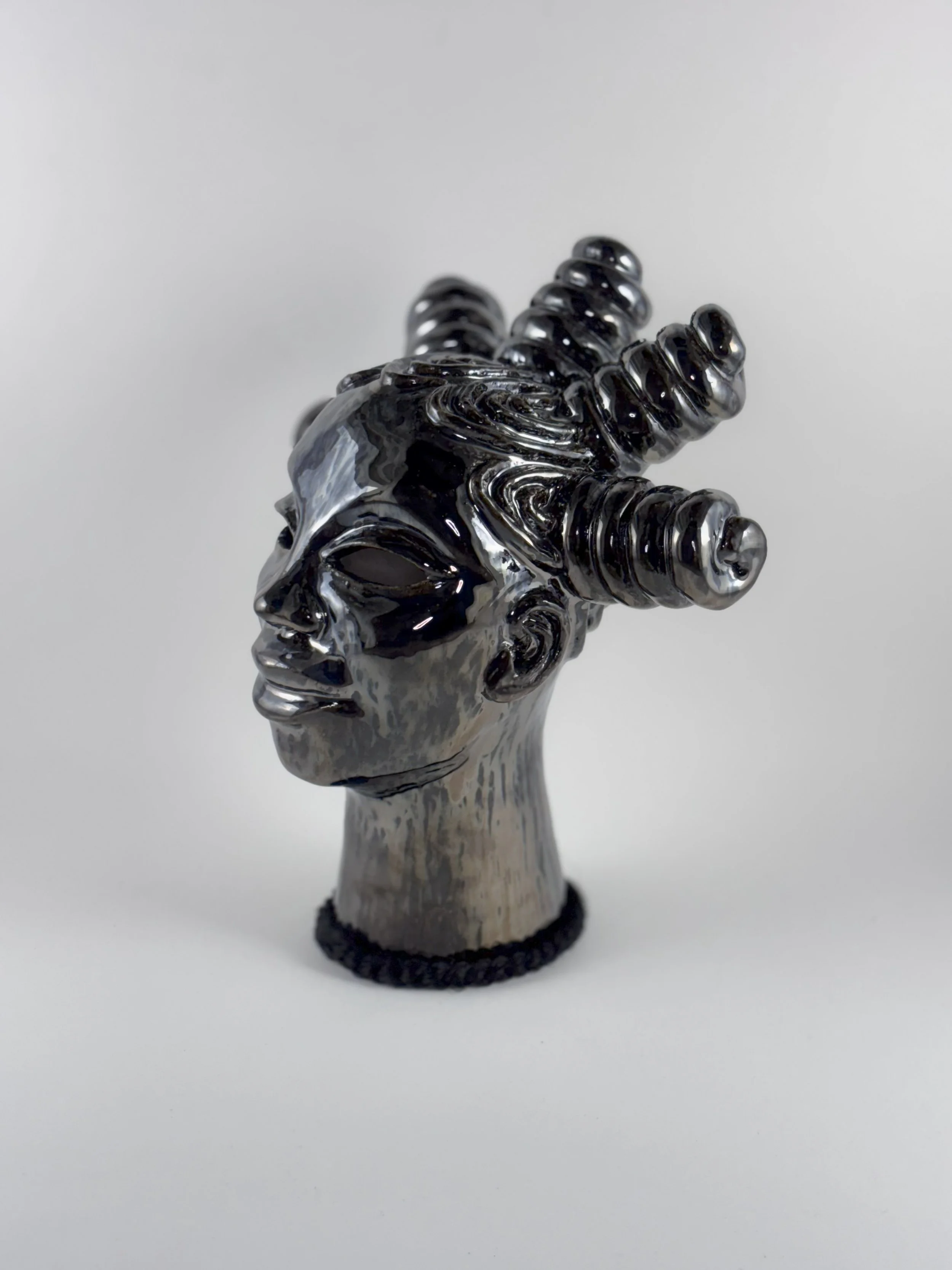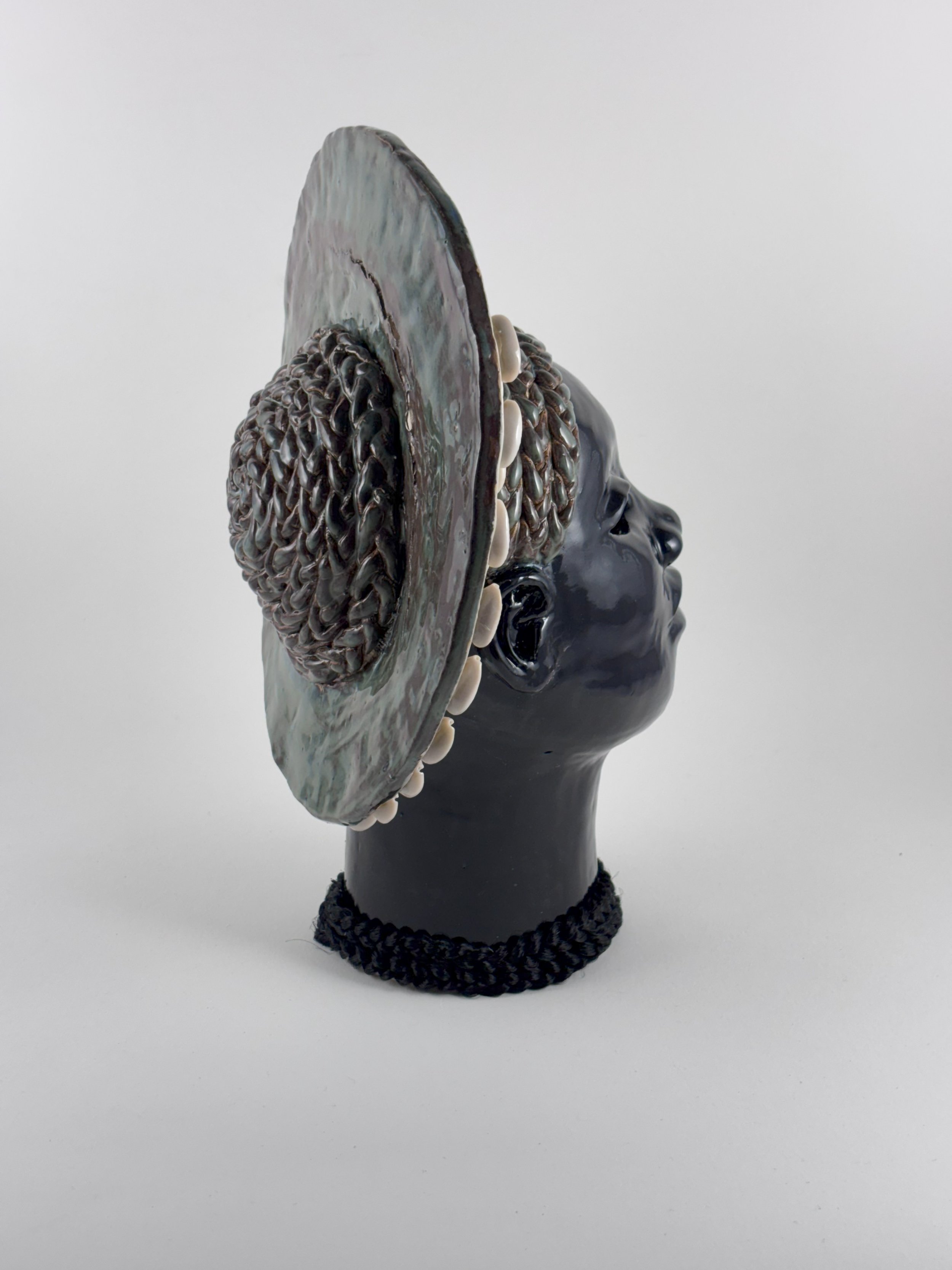 Hairhood: the Strands that Connect Us is a collection of ceramic sculptures that explore the ways in which hair and hairstyling connect black women, femmes, and girls. Through form, structure, and texture, these sculptures aim to make visible the figurative and literal bonds between Black women and femmes. Braids, twists, locs, bantu knots, and cornrows appear in the pieces as structural supports physically linking the femme figures to each other to investigate themes of intimacy, care, and closeness. Through an afro-futurist aesthetic and structurally intricate forms, these works play with the limits of what Black hair can do visually and culturally.